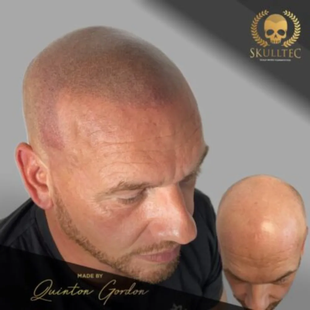 Quinton Gordon is artist-in-chief at Skulltec’s Exeter clinic, offering the transformative hairline we have become best known for. Friends since childhood, Quinton and Barry grew up together and found yet one more thing in common between them….hair loss!